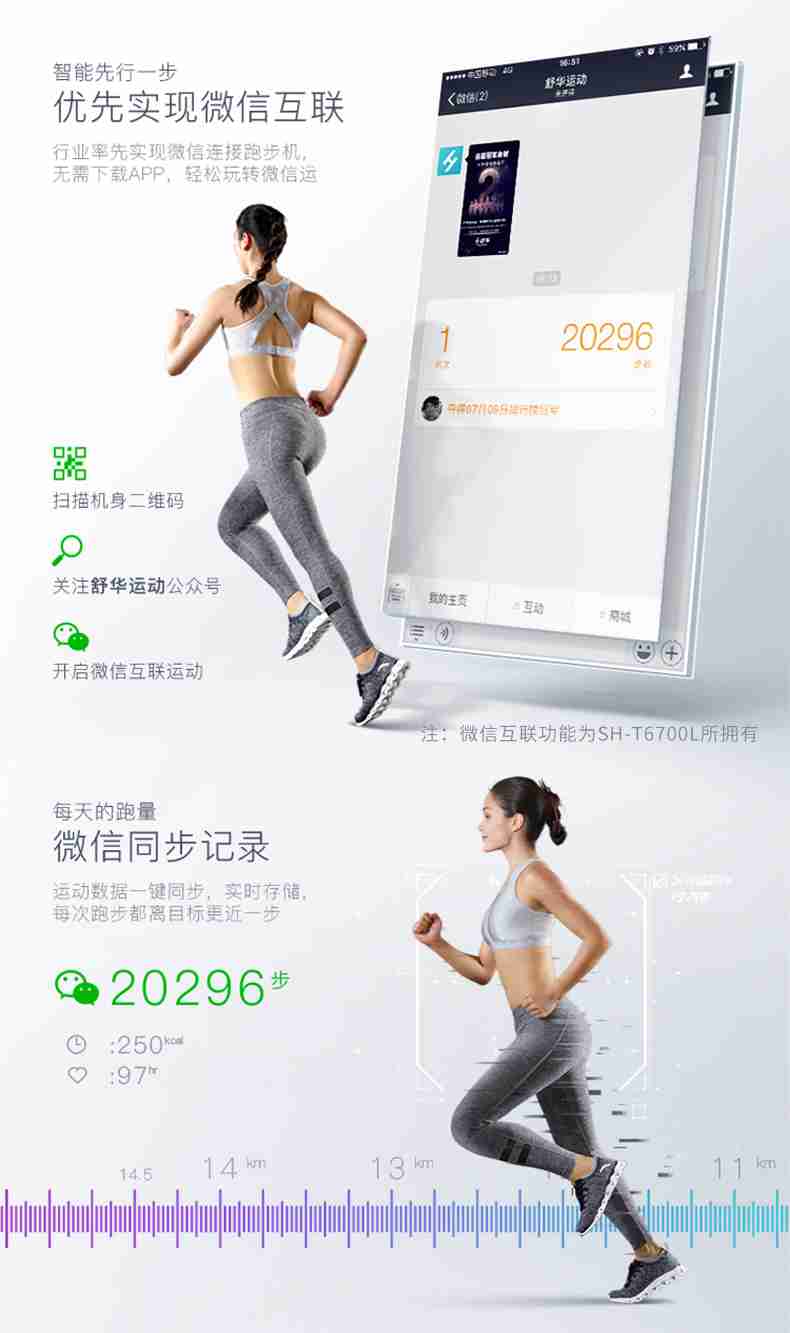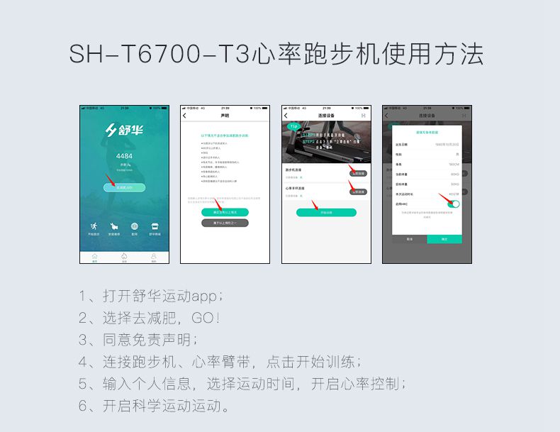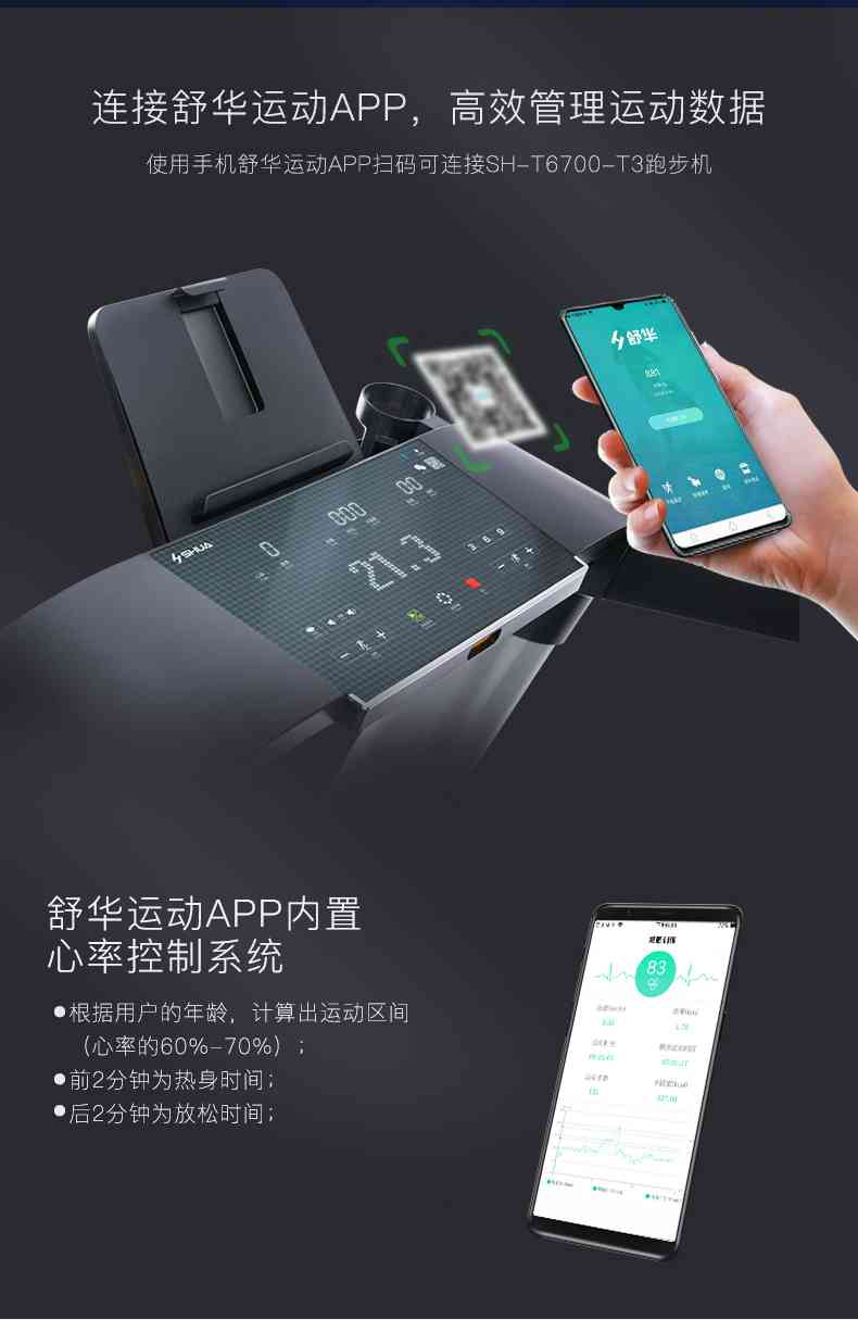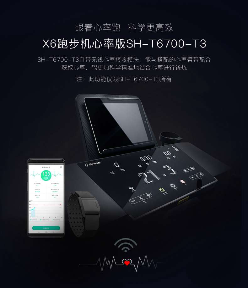 SH-T6700-T3跑步机为了帮助用户进行更加科学有效的运动,搭载快盈VIIIAPP连接心率臂带实现心率控制,通过监测运动心率从而实现科学运动。