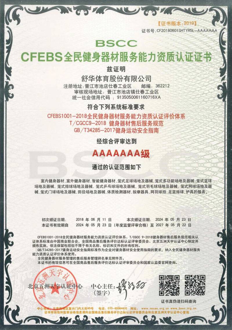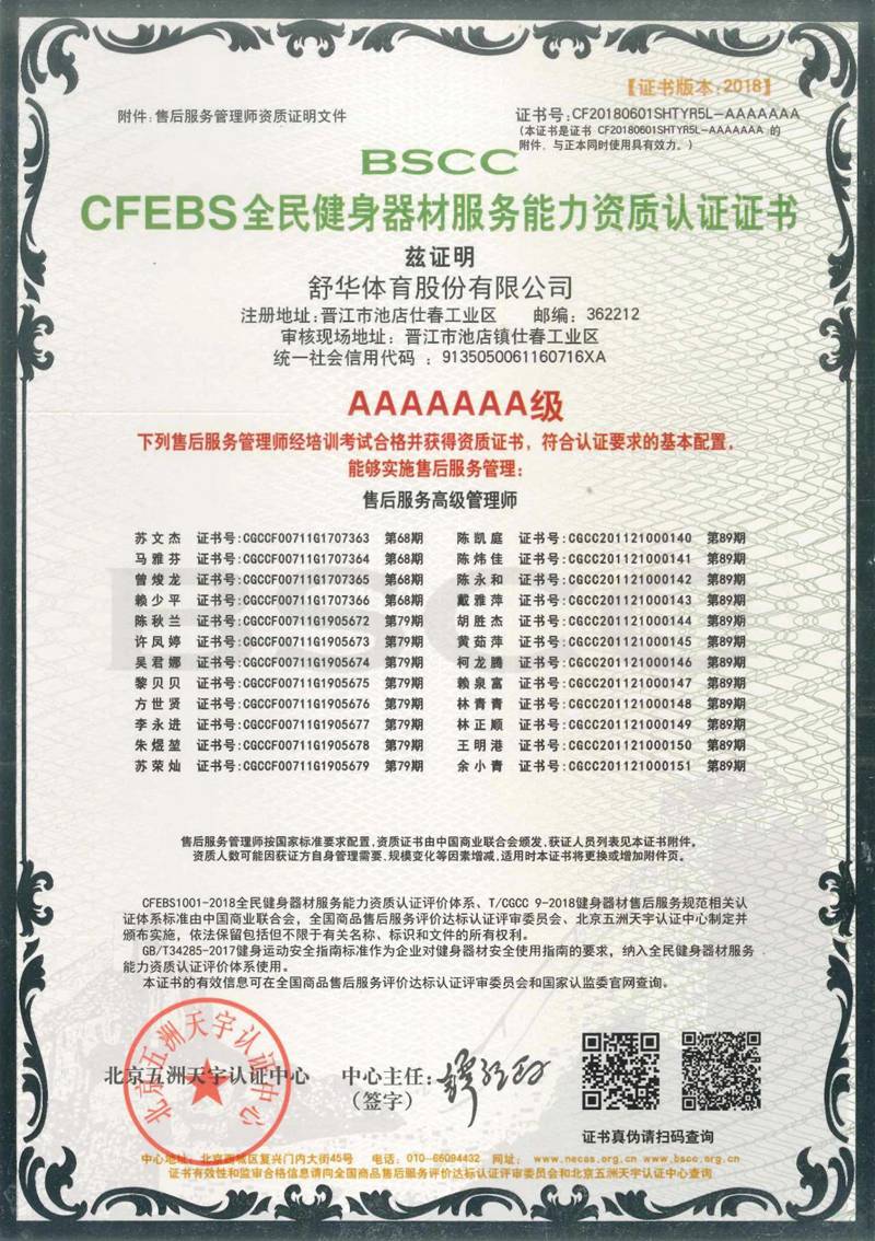 快盈VIII以用户满意作为服务追求,凭借专业的技术能力及服务保障能力、有效的售后服务体系,获得“BSCC-CFEBS 全民健身器材服务能力资质认证证书 AAAAAAA 级”,部分员工经培训考试合格并获得“BSCC-CFEBS 全民健身器材服务能力资质认证证书-售后服务高级管理师(AAAAAA 级)。