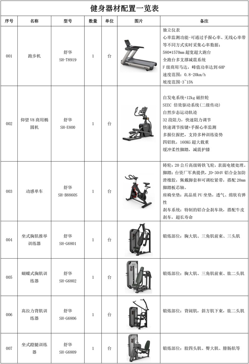 1.快盈VIIIV9智能跑步机SH-T8919*5台-独立仪表-简洁大气,全新外观设计,健康运动新选择;心率监测功能,可通过手握心率、无线心率带等不同方式实时采集心率数据;580*1570mm超宽超大跑台-跑感舒适,跑台整体安全稳定;全跑台多支撑减震平台,保证跑台超强支撑力,达到180kg支撑,满足专业健身房需求。F级商用马达-超强马达,AC 3.0HP 交流,峰值功率达到6HP,F级商用品质。速度范围达到0.8-20km/h;V9跑步机可实现跑台扬升功能,坡度范围-3~15%,满足客户不同的锻炼需求。
